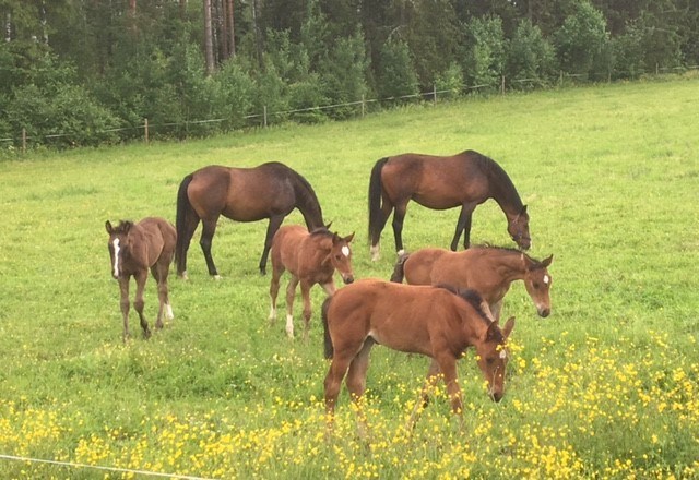 Alla våra egna föl har kommit. Vi har haft ett otursår med två kastningar och en fölning där både sto och föl förolyckades. På något konstigt sätt går oturen i skov tror jag. Det är några bra år emellan och sen kommer det år då allt går åt skogen. Men samtidigt har vi fått fem stycken välskapta föl som vi naturligtvis gläds över så man måste se saken från den ljusa sidan. Dessa är födda hos oss i år:
