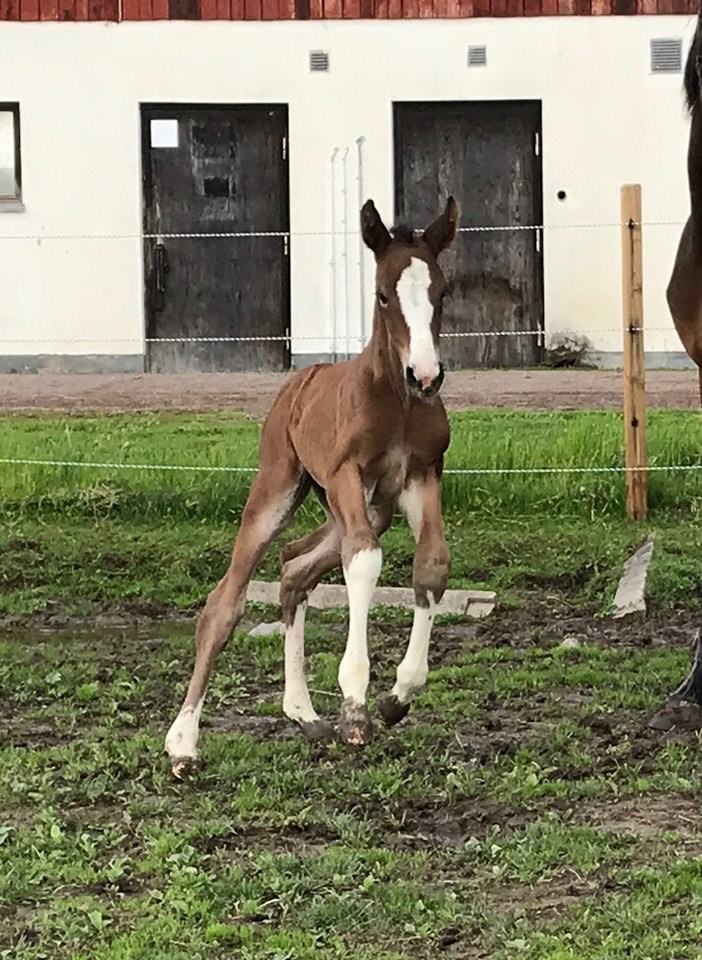 Nummer fyra kom igår och jag var helt säker på att det var en hingst, men icke... ett stort sto där någon målat med mycket färg! Borde vara en keeper men det här är en häst som förtjänar att komma ut på de stora banorna. Pappa är den lovande hingsten Million Dollar och mamma heter Heather Primera. Till salu till etablerad tävlingsryttare.