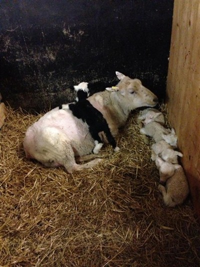 Ut och kolla. En pigg rackare som snabbt var på benen och hittade spenen. Men jag tyckte det var lite fissigt, för tackan var rätt stor, och bara ett lamm liksom? Men snart kom en till. Och ett till. Och... till slut var de fem stycken! Fyra tacklamm och ett bagglamm.